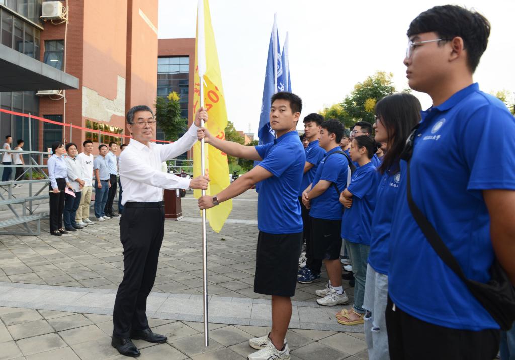 院长余学祥为2023级新生班级授班旗,各班负责人接旗。