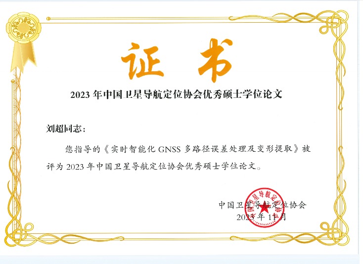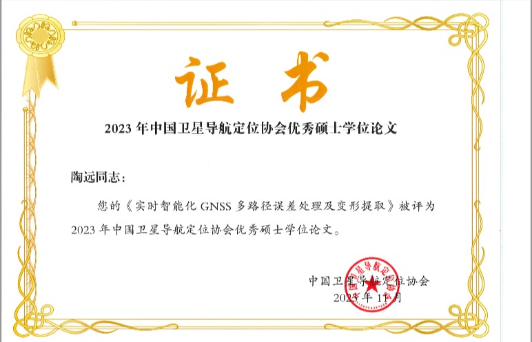刘超副教授指导的2021届硕士研究生陶远撰写的学位论文《实时智能化GNSS多路径误差处理及变形提取》被评为2023年中国卫星导航定位协会优秀硕士学位论文。此次硕士学位论文入选中国卫星导航定位协会优秀硕士学位论文,不仅是对我校导航与定位领域学术成果的认可,也是对学校研究生培养质量的肯定。