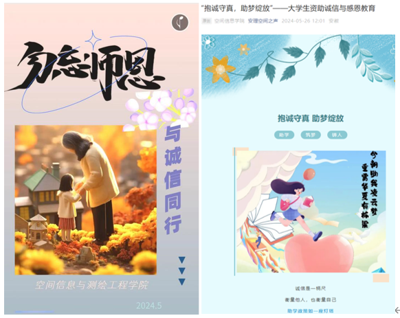 官网、微信公众号平台、易班、主题宣传栏等方式面向学生进行防范网络诈骗知识、资助诚信及金融知识、“诚信自强之星”学子风采进行广泛宣传展示,营造浓厚氛围,汇聚诚信力量。