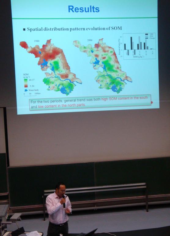 教师赵明松博士参加此次会议,并在第一分会场作了题为“Spatial-Temporal Variability of Soil Organic Matter and Driving Forces in Jiangsu, China”的学术报告;报告以江苏省为例,分析讨论了自上世纪80年代以来近30年江苏省土壤耕作层有机质含量时空演变特征及其驱动机制。