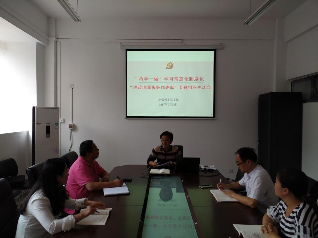 根据《安徽理工大学关于推进“两学一做”学习教育常态化制度化的实施方案》、《关于在推进“两学一做”学习教育常态化制度化中开展“讲政治、重规矩、作表率”专题教育的实施方案》的文件要求,5月18日下午,地信教工党支部在南404会议室召开“讲政治、重规矩、作表率”专题组织生活会,大发