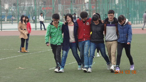 本次运动会共有三场比赛。第一场是“六人绑腿跑”,每院出三男三女共六名队员排成一排,每个队员的左、右腿分别和队友的右、左腿绑在一起并跑出50米。比赛时,九组选手中有的举步维艰地走着;有的慢慢悠悠地走着;也有的能够步伐一致,快速地跑向终点。第二场是“摸石头过河”,“河”宽10米左右,每院三名男生在此岸,三名女生在彼岸,过“河”的选手拿两本书当作石头,轮换地踩着两个“石头”过河,达到对岸之后,将“石头”交给队友,队友再过河,如此反复直到全部队员过河为止。过河时,选手们各种走姿频出,有的侧身横过,有的蹦蹦跳跳,第三场是“万里长城永不倒”,每院12名选手围成一个圈,前面的人坐在后面队员的腿上,不能倒也不能站起来,坚持的时间越长,得分也越高。开始时,各组队员还有说有笑,有甚者还向其他院的对手唱起了国歌,引得大家哈哈大笑。过了大约二十几分钟后,陆续有小组起来或倒下了。