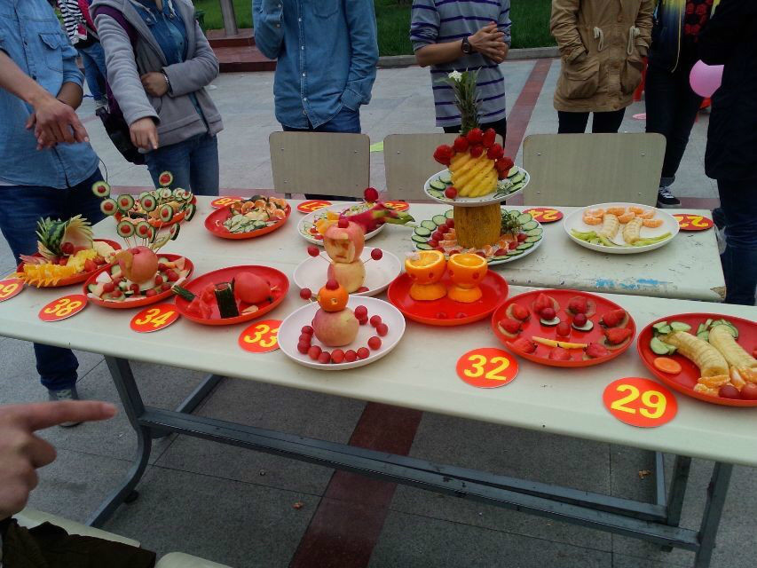 一场水果的盛典将大家的目光聚集到了喷泉广场。随着主持人上场致词,比赛正式开始。首先是20分钟的现场制作环节:参赛者们两人或三人一组,用事先准备好的新鲜水果,在规定的20分钟内各显身手,有的同学流水作业,手法熟稔快速的完成了简约而不简单的拼盘。有的同学精雕细琢,细致精美的雕工造就了雅致的拼盘。“凤凰图腾”、“海豚之恋”,每位选手都对自己的作品赋予了美好的寓意,五彩斑斓的艺术品为阴霾的天气注入了一缕清新的阳光。最后,张娟、盛雪晴等小组凭借精美的制作受到评委们的一致好评,夺得本次大赛一等奖。