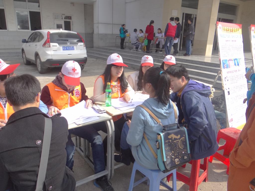 红十字志愿服务队联合淮南市红十字会、校爱心社在北校区三号楼前举行造血干细胞捐献活动。